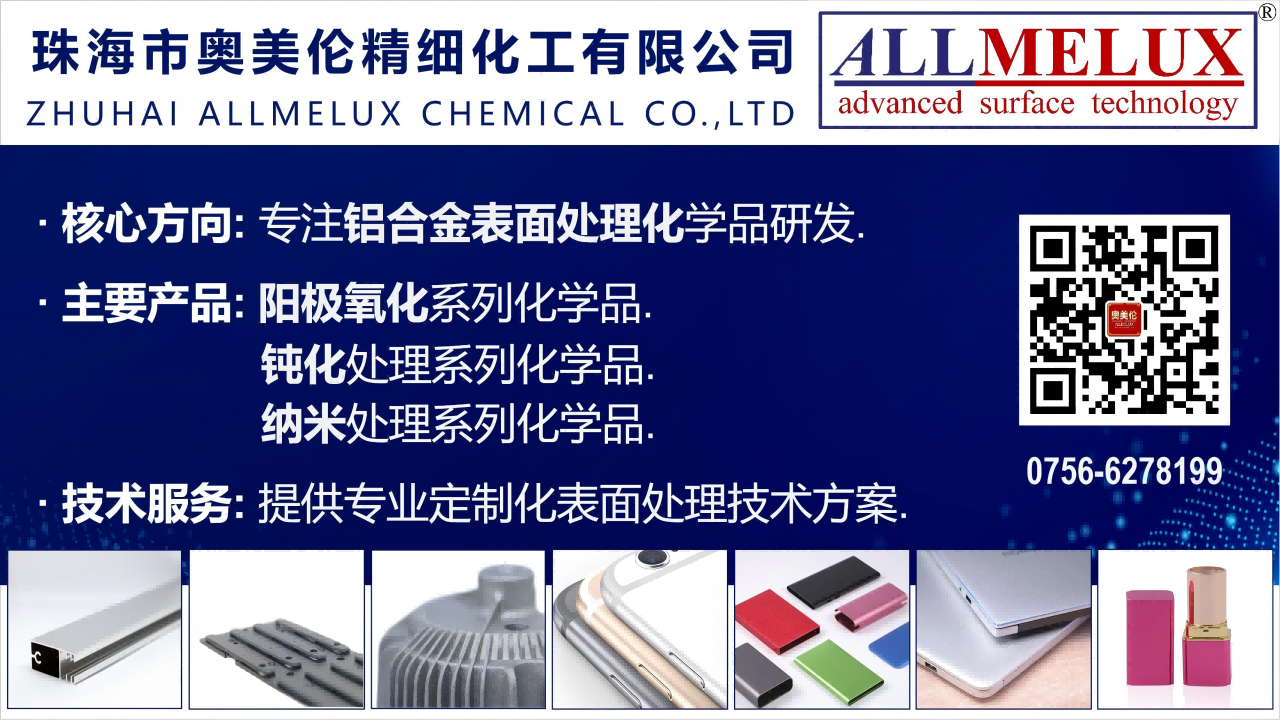 Zhuhai Allmelux Chemical Co., Ltd., established in 2006, is located in the Fine Chemical Zone of Gaolan Port in Zhuhai. As a recognized High and New Technology Enterprise in China, Allmelux is committed to developing advanced, environmentally friendly chemicals and additives for metal surface treatment.The company offers three core product series: Anodizing Treatment Agents, Passivation Agents, and Nano Treatment Agents. These products have reached internationally advanced performance levels and are widely used in electronic communications, automotive parts, building materials, and other industries.Recently, Allmelux developed a new sealing agent that provides a delicate “skin-feel” finish and excellent hydrophobic properties for anodized products. It significantly enhances cleanability and corrosion resistance. 珠海市奥美伦精细化工有限公司成立于2006年,位于珠海市高栏港精细化工专区,专注于环保型铝合金表面处理化学品的研发及生产,是国家高新技术企业和广东省专精特新中小企业。奥美伦拥有自主研发的三大核心产品系列: 阳极氧化处理、钝化处理和纳米处理系列化学品,产品技术性能达国际先进水平,广泛应用于电子通讯、汽车零部件、建筑材料等领域。近来,奥美伦全新推出新型阳极氧化封闭剂,其可赋予阳极氧化产品细腻的“肤感”外观和优异的疏水特性,显着提升易清洁性与耐蚀性。奥美伦秉持“以人为本、精益求精、积极进取”的管理理念,持续为客户提供优质表面处理解决方案,推动行业绿色化发展。 珠海市奥美伦精细化工有限公司成立于2006年,位于珠海市高栏港精细化工专区,专注于环保型铝合金表面处理化学品的研发及生产,是国家高新技术企业和广东省专精特新中小企业。奥美伦拥有自主研发的三大核心产品系列: 阳极氧化处理、钝化处理和纳米处理系列化学品,产品技术性能达国际先进水平,广泛应用于电子通讯、汽车零部件、建筑材料等领域。近来,奥美伦全新推出新型阳极氧化封闭剂,其可赋予阳极氧化产品细腻的“肤感”外观和优异的疏水特性,显着提升易清洁性与耐蚀性。奥美伦秉持“以人为本、精益求精、积极进取”的管理理念,持续为客户提供优质表面处理解决方案,推动行业绿色化发展。