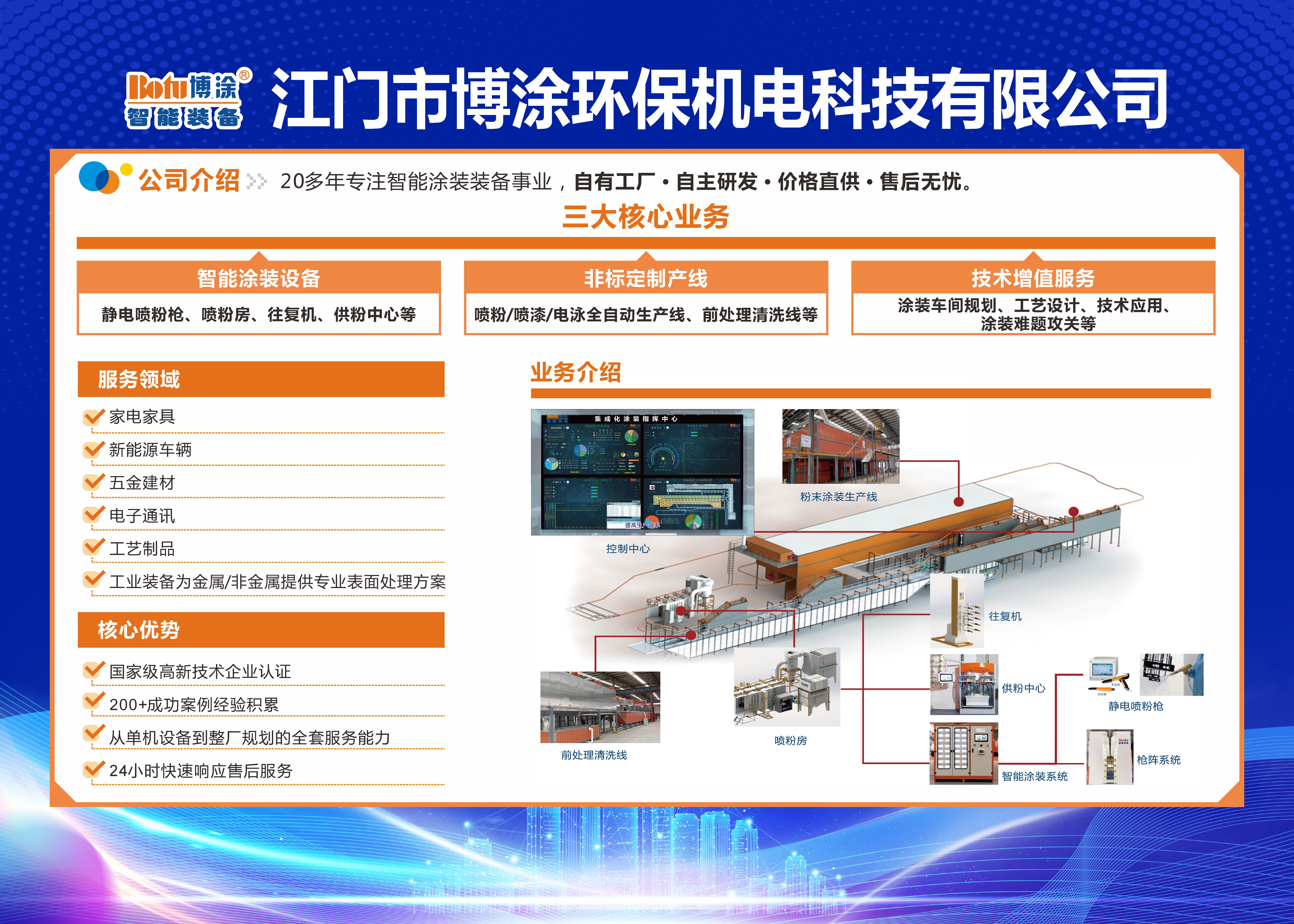 Jiangmen BOTU Environmental Protection Electromechanical Technology Co., Ltd. is a high-tech enterprise with years of rich industry experience. Specializing in intelligent equipment, the company integrates equipment design and manufacturing with application services, including both pre-sales and after-sales support. Its main products include electrostatic powder spraying guns, powder spraying chambers, reciprocators, powder feed centers, and other related equipment. BOTU also undertakes non-standard customized production line projects such as powder spraying lines, spray painting lines, electrophoresis lines, and pre-treatment cleaning lines. In addition, the company provides painting technical services, including workshop planning, process design, technical application, and solutions to painting-related challenges.BOTU serves a wide range of industries focused on surface anti-corrosion and aesthetic treatment for both metal and non-metal materials. These industries include household appliances, furniture, heavy machinery, new energy, automobiles, motorcycles, bicycles, steel structures, aluminum profiles, communication equipment, lighting, ceramics, glass, bamboo and wood products (such as MDF), plastics, and more. 江门市博涂环保机电科技有限公司是一家累积有多年丰富经验的高科技公司,集设计、设备制造、应用服务售前售后为一体的“智能装备”高新技术企业。公司业务分为“涂装设备”产品、非标订制“生产线工程项目”、涂装技术服务三大部分。主营产品:一、静电喷粉枪、喷粉房、往复机、供粉中心等;二、非标订制工程项目: 喷粉线、喷漆线、电泳线、前处理清洗线等;三、涂装技术服务: 涂装车间规划、工艺设计、技术应用、涂装难题解决方案等。业务服务对象:家电、家具、重工机械、新能源、汽车、摩托车、自行车、钢结构、铝型材、通讯设备、灯饰、陶瓷、玻璃、竹木制品(MDF)、塑料等金属与非金属的表面防腐与美工处理行业。 江门市博涂环保机电科技有限公司是一家累积有多年丰富经验的高科技公司,集设计、设备制造、应用服务售前售后为一体的“智能装备”高新技术企业。公司业务分为“涂装设备”产品、非标订制“生产线工程项目”、涂装技术服务三大部分。主营产品:一、静电喷粉枪、喷粉房、往复机、供粉中心等;二、非标订制工程项目: 喷粉线、喷漆线、电泳线、前处理清洗线等;三、涂装技术服务: 涂装车间规划、工艺设计、技术应用、涂装难题解决方案等。业务服务对象:家电、家具、重工机械、新能源、汽车、摩托车、自行车、钢结构、铝型材、通讯设备、灯饰、陶瓷、玻璃、竹木制品(MDF)、塑料等金属与非金属的表面防腐与美工处理行业。