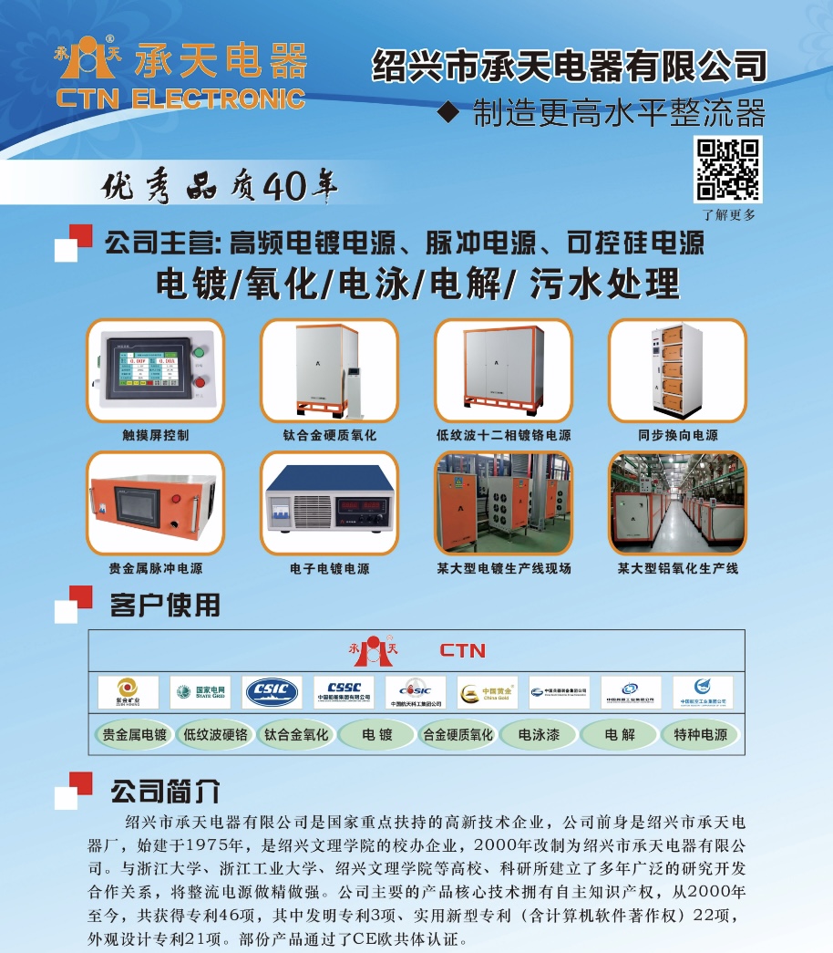 Shaoxing Chengtian is a high-tech enterprise that receives key support from the state. The company specializes in manufacturing a range of metal surface treatment technologies, including intelligent high-frequency switching power supplies, thyristor rectifiers, synchronous power supplies, pulse power supplies, hard oxidation pulse power supplies, electrophoresis power supplies, and PCB electronic electroplating systems.These products are widely applied in fields such as electroplating, oxidation, electrolysis, automotive electrophoresis, charging, coloring, and the production of precious metal electroplating. 绍兴承天是国家重点扶持的高新技术企业,公司专业生产智能高频开关电源、可控硅整流器、同步电源、脉冲电源、硬质氧化脉冲电源、电泳电源、PCB电子电镀等系列金属表面处理,广泛应用于电镀、氧化、电解、汽车电泳、充电、着色、贵金属电镀等生产领域。 绍兴承天是国家重点扶持的高新技术企业,公司专业生产智能高频开关电源、可控硅整流器、同步电源、脉冲电源、硬质氧化脉冲电源、电泳电源、PCB电子电镀等系列金属表面处理,广泛应用于电镀、氧化、电解、汽车电泳、充电、着色、贵金属电镀等生产领域。